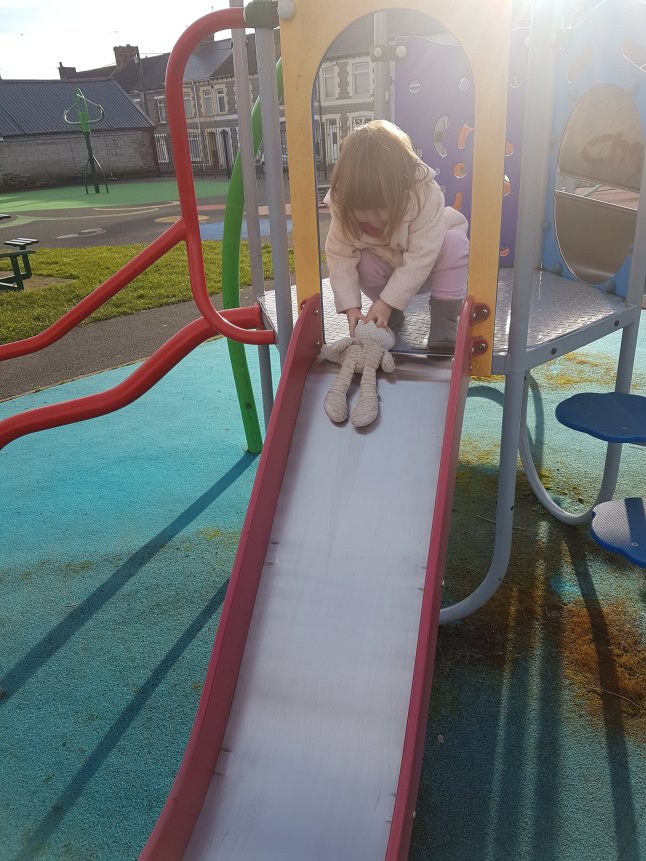 He comes with her everywhere at the moment. He came with us to the playground opposite our house. She pushed him lovingly back and forth on the swing until, inevitably “Freddie glide!” (Slide, of course!)
