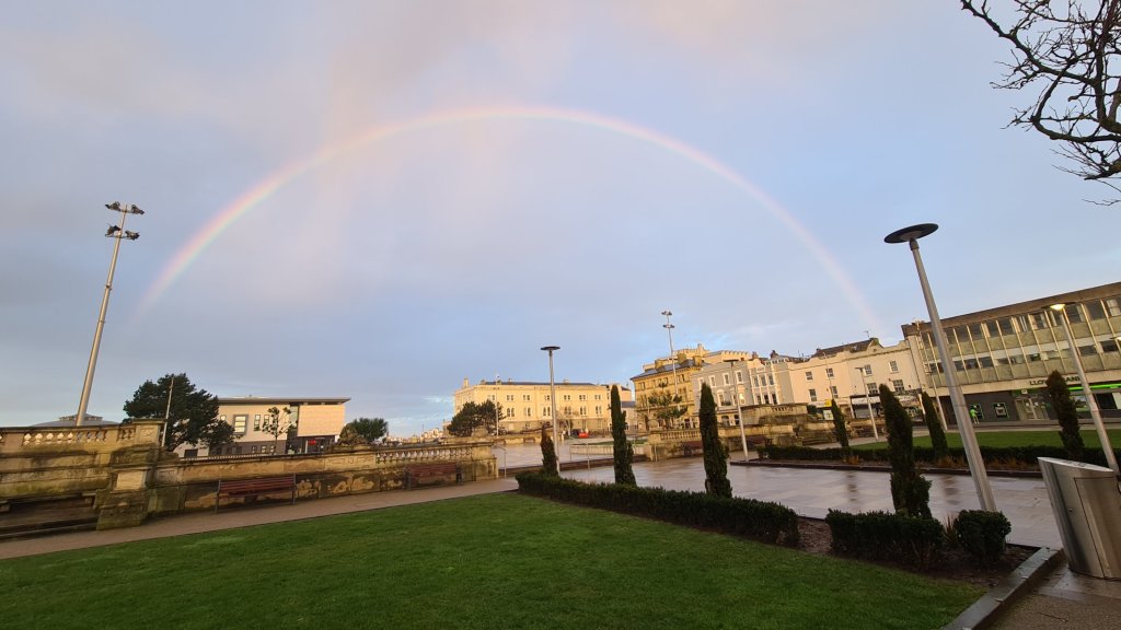 We’ll start with my mum’s rainbow. It appeared over the hotel I stayed in thenight before her funeral, as we headed back so I could put on my rainbow dress in her honour. Everyone in my family, knowing that she sang “Somewhere Over the Rainbow” to me in our last conversation, messaged me to tell me Mum was with me on this, the hardest of days. Rainbows mean the world now and Squidge and I always say “Hi Granny” whenever one appears.